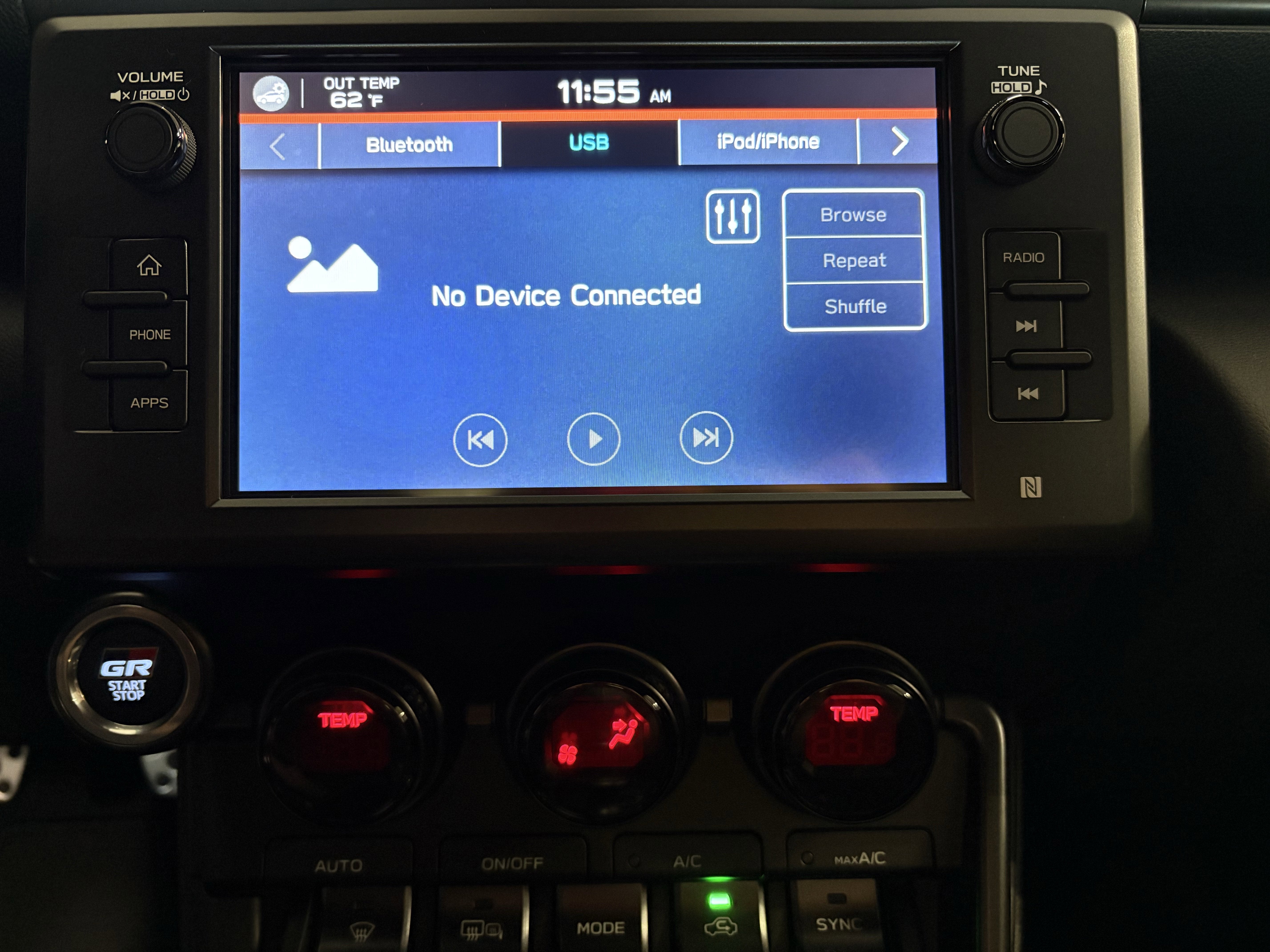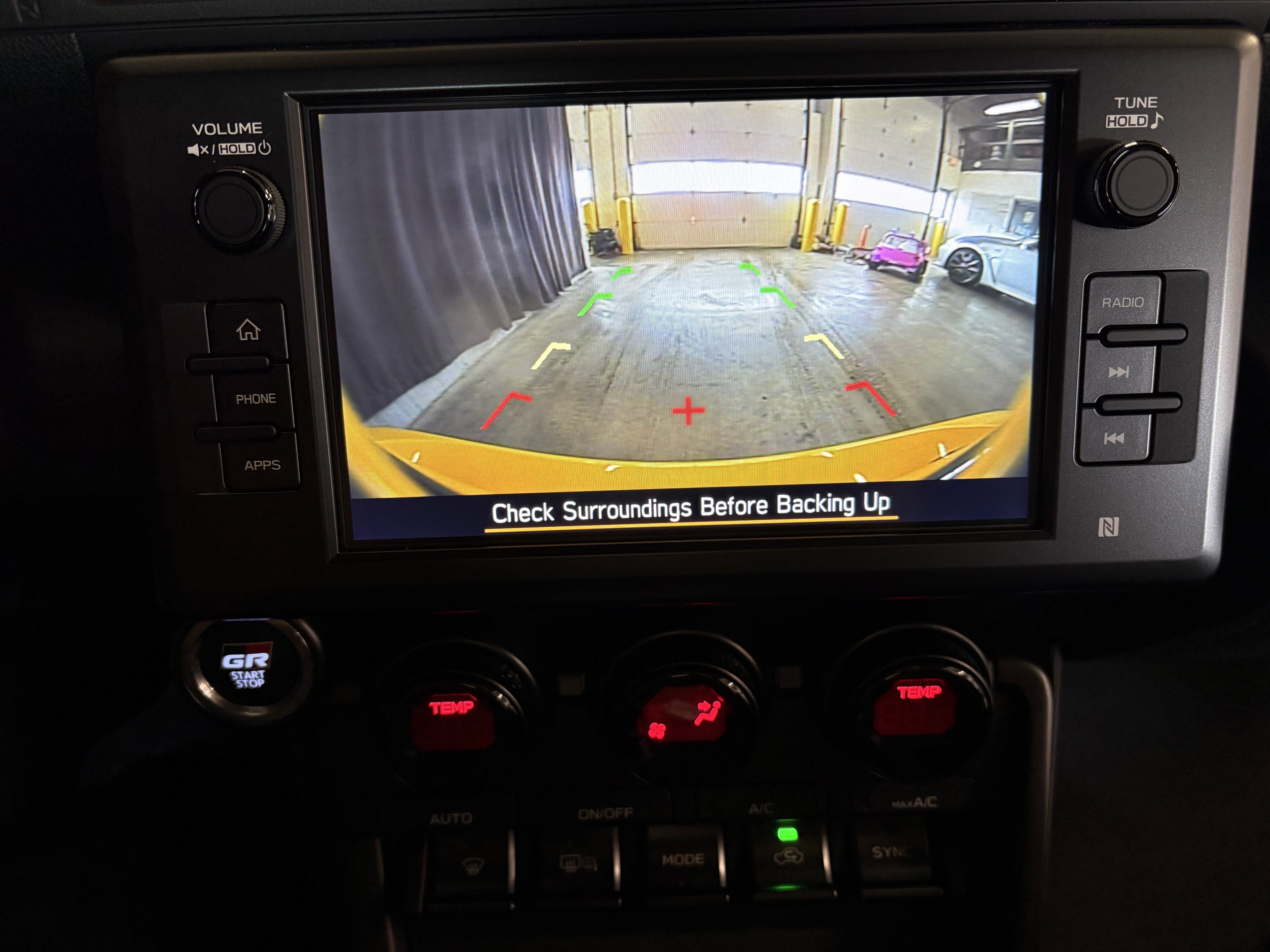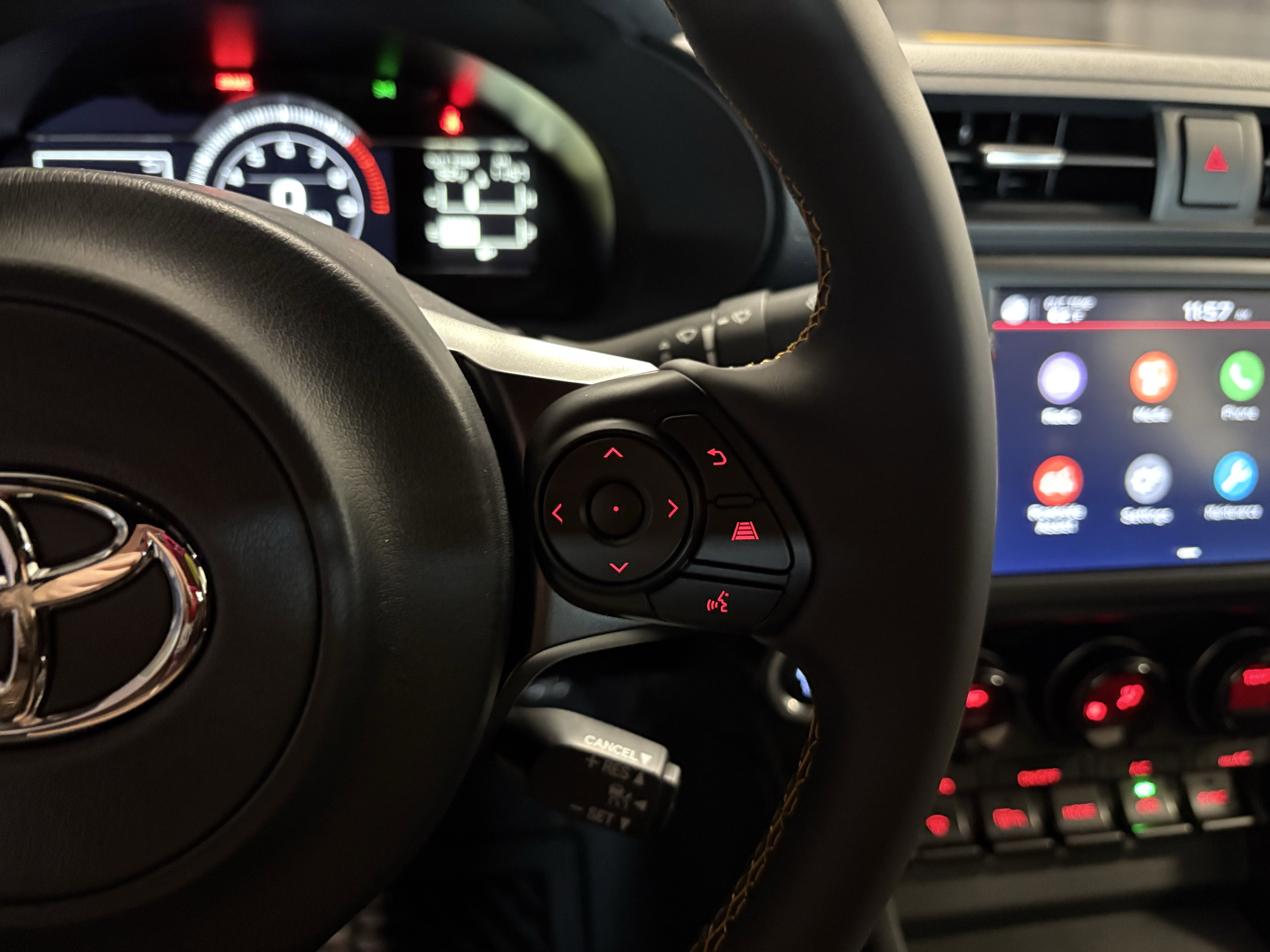 - GR leather-trimmed manual tilt/telescopic 3-spoke sport steering wheel with yellow contrast stitching, audio, Multi-Information Display (MID), and Adaptive Cruise Control button
