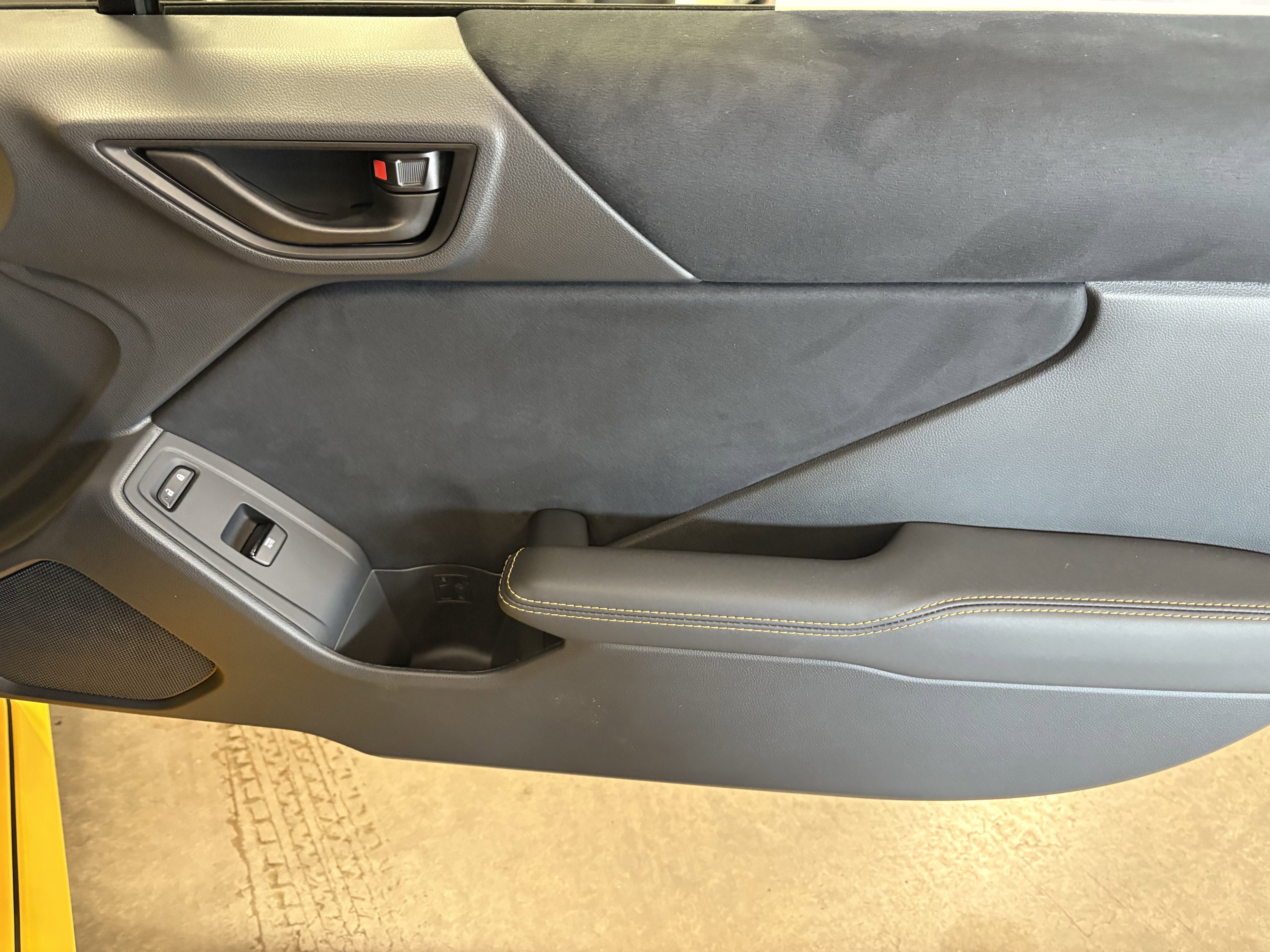 - Leather-trimmed gearshift boot with yellow contrast stitching