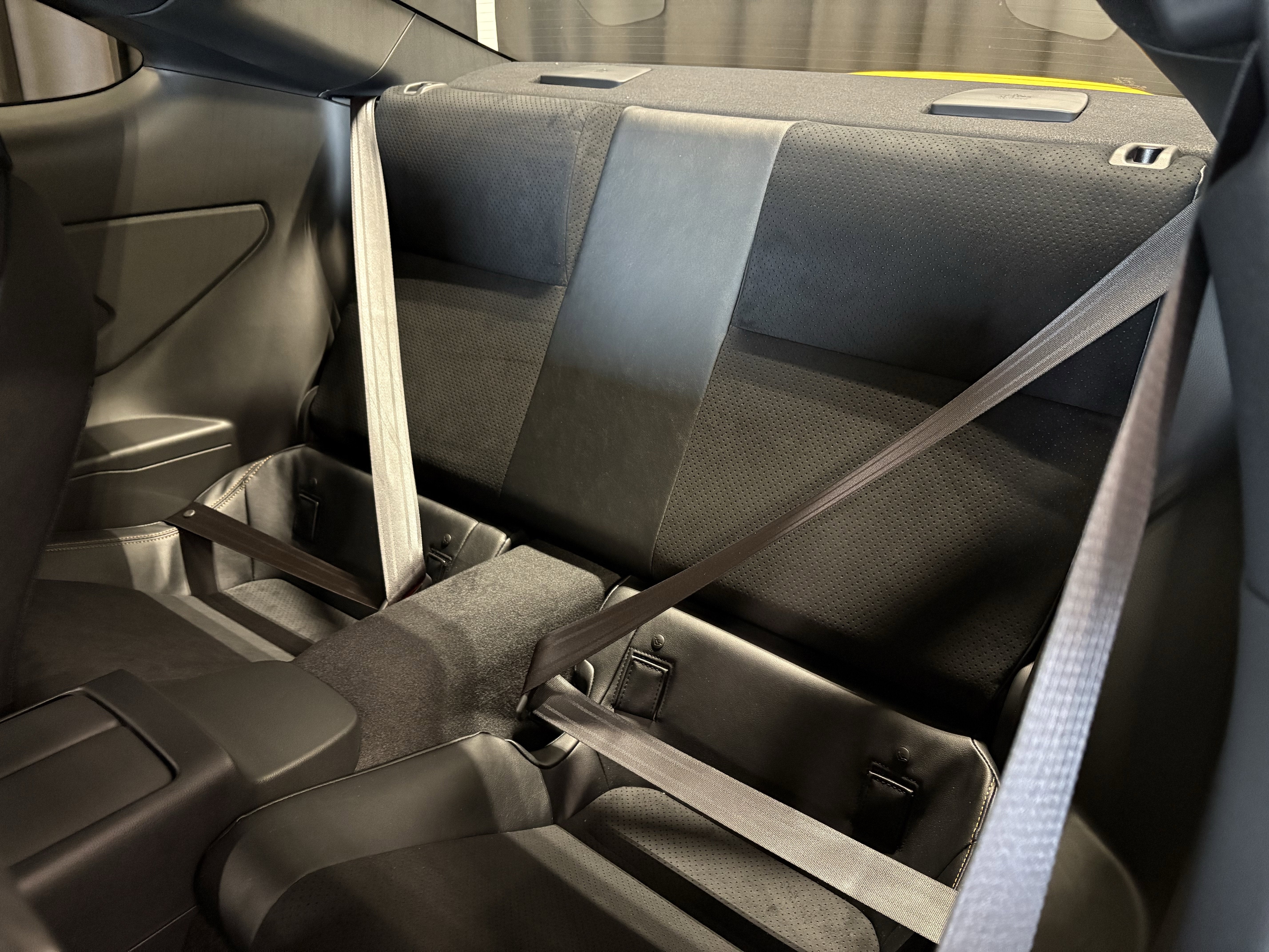 - Two-stage heated sport seats with black leather-trimmed bolsters, Ultrasuede®-trimmed inserts with yellow perforation and yellow contrast stitching; 6-way adjustable driver's seat with seatback pocket; 4-way adjustable front passenger seat with seatback pocket