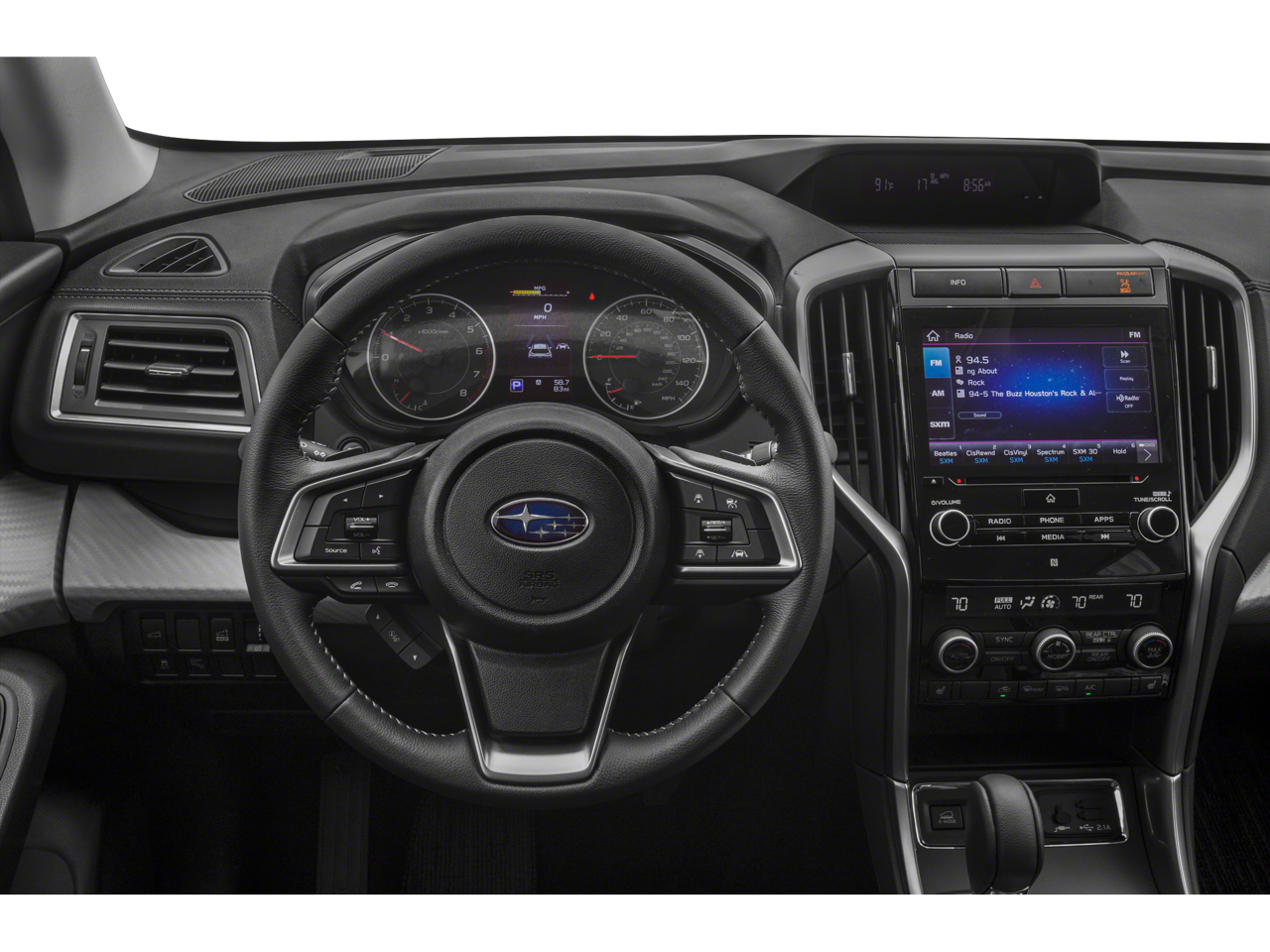 - Radio: Subaru STARLINK 8.0" Multimedia Plus System -inc: AM/FM stereo HD Radio w/single disc CD player, MP3/WMA/CRR/RW file capability, multi touch gesture high resolution LCD display screen, voice activated controls, Bluetooth® audio streaming connectivity, Bluetooth® hands-free phone connectivity, Bluetooth® hands-free SMS text messaging connectivity (applicable w/compatible cell phone), Near Field Communication (NFC), iPod control capability, SiriusXM All Access radio (subscription required), SiriusXM Travel Link (subscription required), smartphone integration for Aha, Android Auto, CarPlay and Pandora, STARLINK cloud applications, steering wheel controls for audio and Bluetooth®, 6 speakers, 3.5mm auxiliary input jack and front and rear dual USB ports